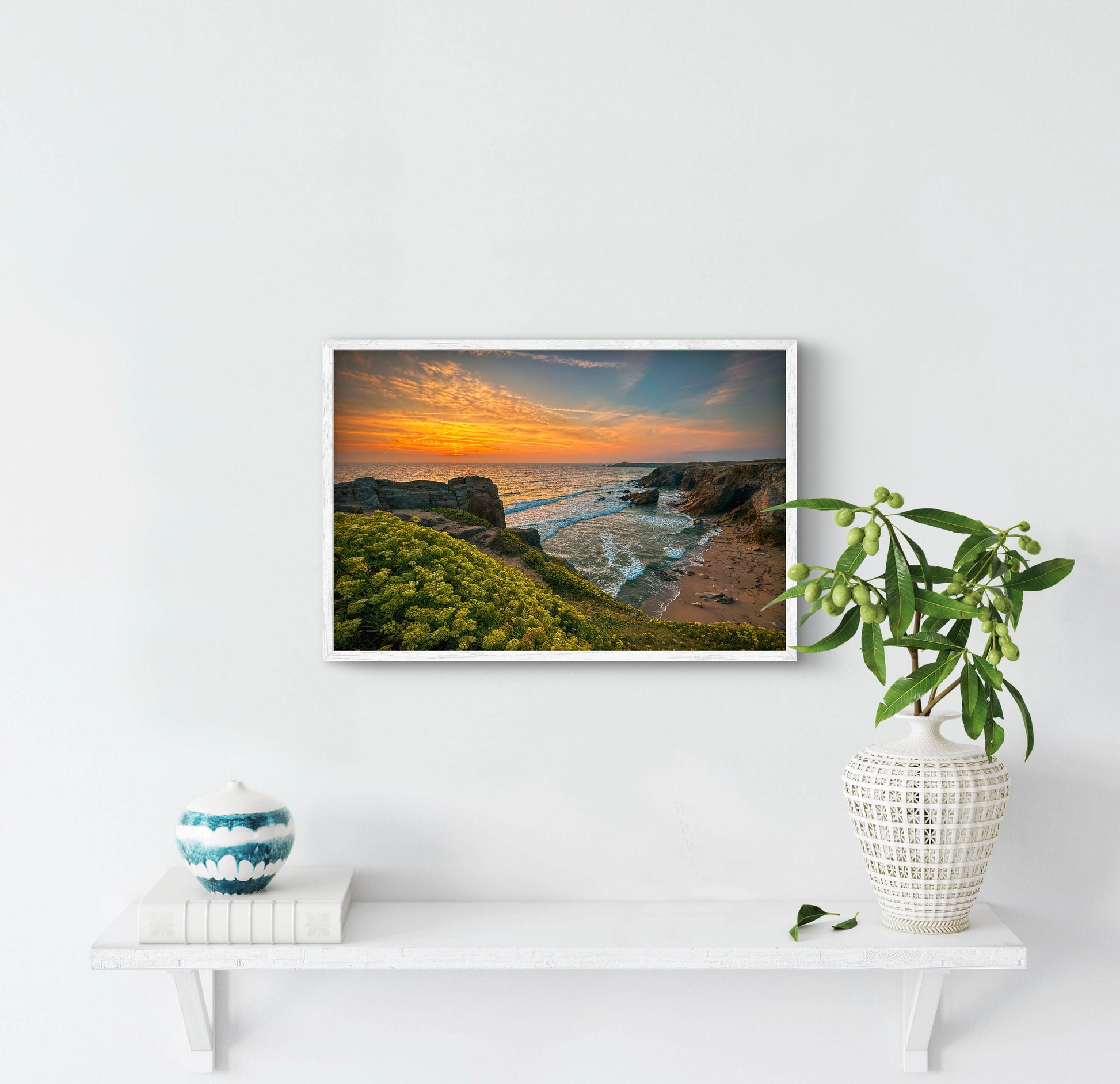 Description: Capturée par le photographe Cyril Bonnet sur la Presqu’île de Quiberon pendant un été, cette photographie révèle un coucher de soleil éclatant sur la côte sauvage de Quiberon. Elle dégage une atmosphère apaisante et apporte une touche de nature authentique à votre intérieur.