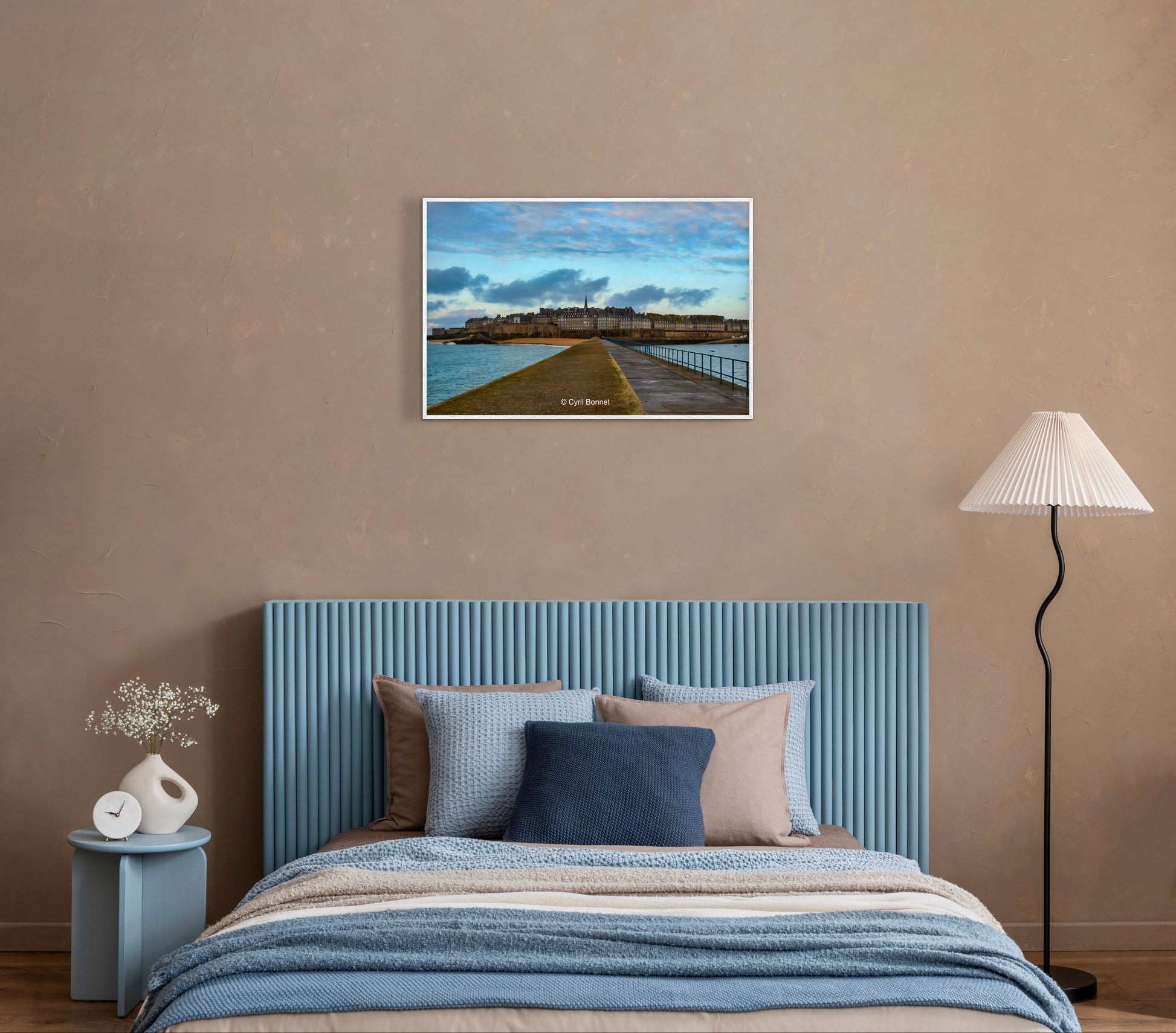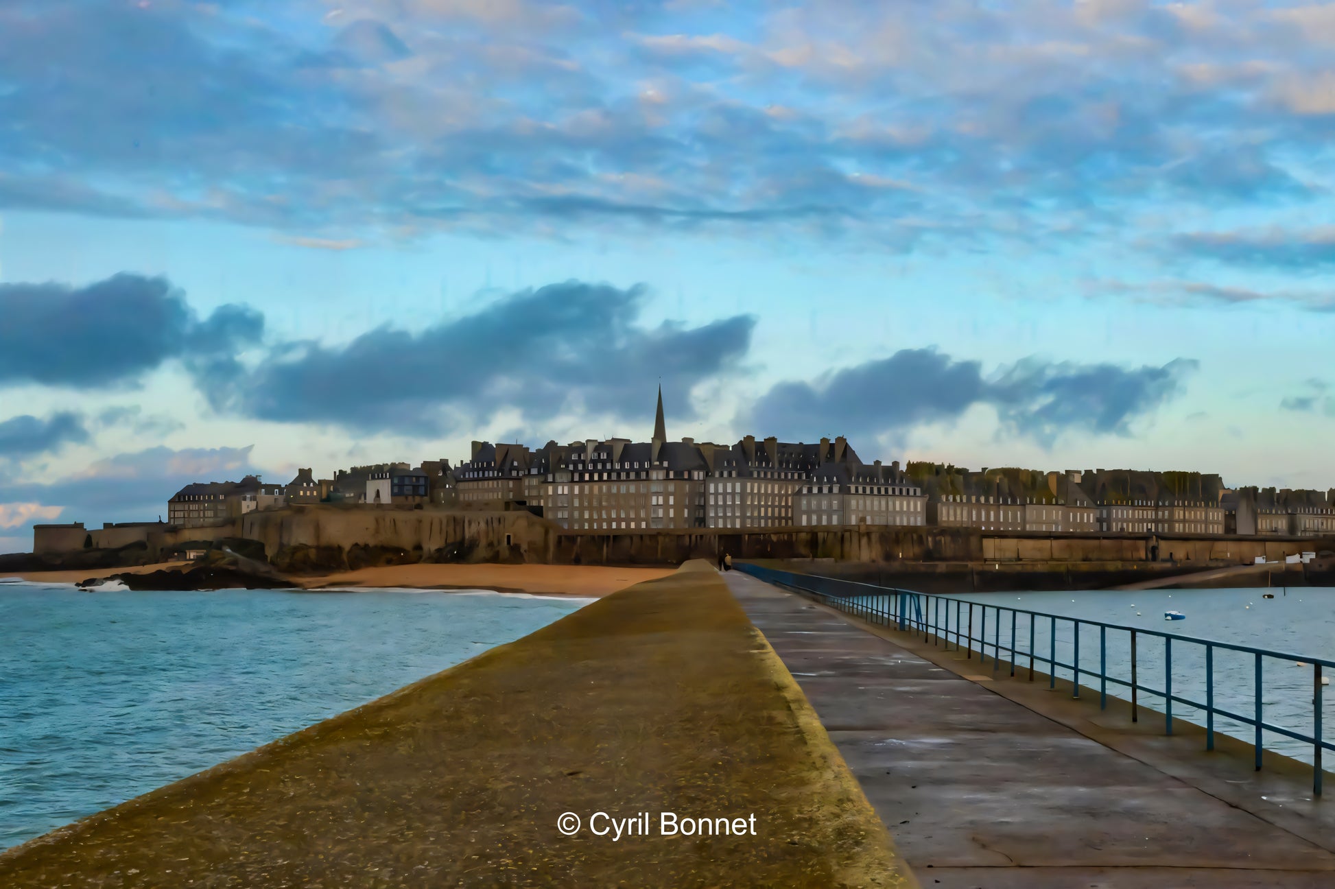 Description : Pendant une journée à Saint-Malo, le photographe Cyril Bonnet à capturé depuis le môle des Noires cette photographie des remparts de Saint-Malo, sous un ciel nuancé de bleu et de nuages. Symbole de la cité corsaire, cette image apporte une touche d’évasion à votre intérieur, avec ses tons bleus qui évoquent le large ou l’horizon semble se fondre entre ciel et mer.