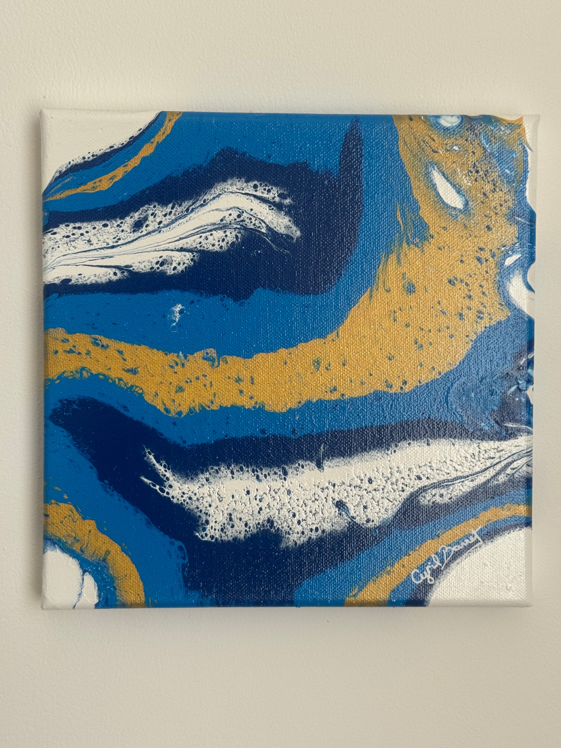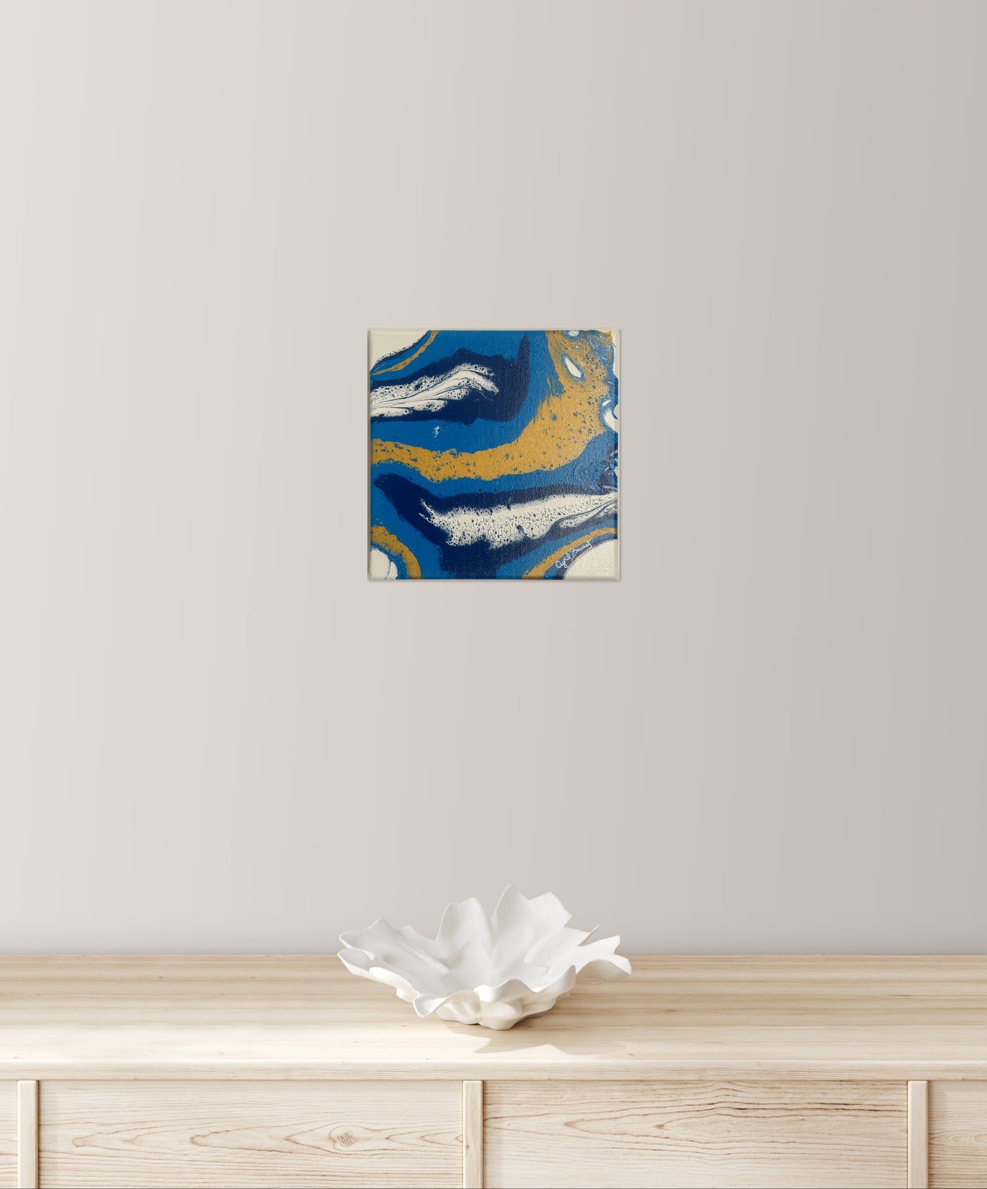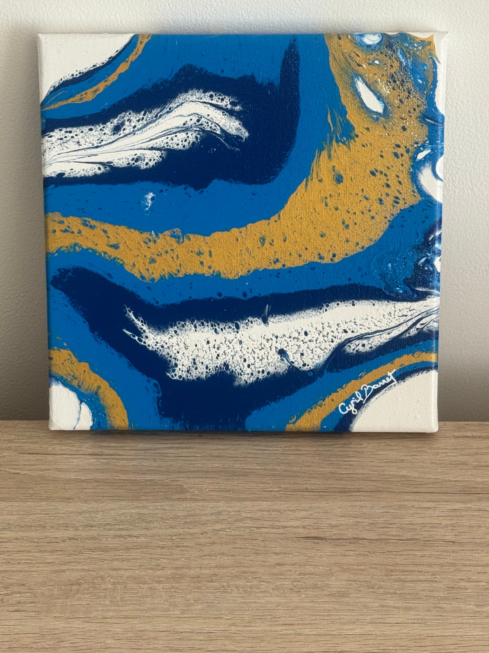 Description : Cette œuvre abstraite joue sur la fluidité et le mouvement des couleurs. Les teintes de bleu s’entrelacent avec les nuances de blanc et de doré, créant des effets de vagues, de lumière et de matière. On n’a l’impression d’observer un paysage à la fois marin et cosmique, d’où le nom “Tenonami” qui signifie “vague céleste” en japonais.